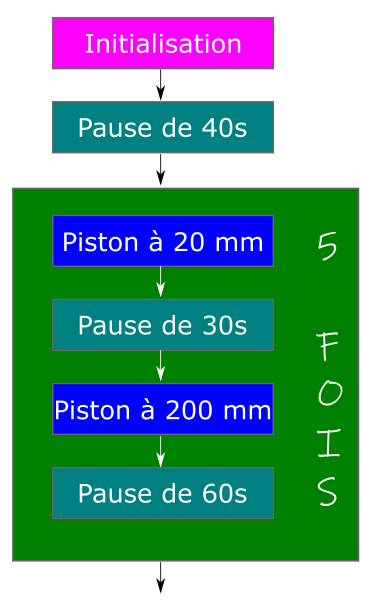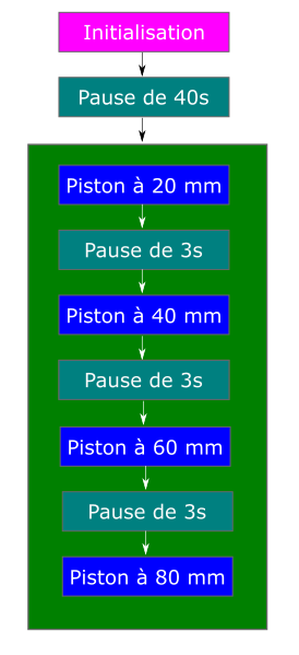 Voila ce à quoi pourrait ressembler la séquence. Encore une fois, nous commençons par initialiser l'actionneur, puis lui laissons le temps d'attendre sa position. Ensuite nous faisons avancer 4 fois le piston, de 20mm en 20mm.