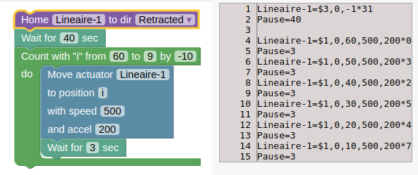 C'est plus court que 4 mouvements seuls ! Imaginez si vous aviez voulu faire 10 mouvements ! D'ailleurs, n'est-il pas le moment de modifier seul(e) cette séquence pour effectuer des mouvements, de la position 60 à la position 10 inclue, par pas de 10mm? Attention au sens !